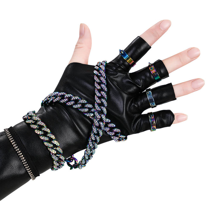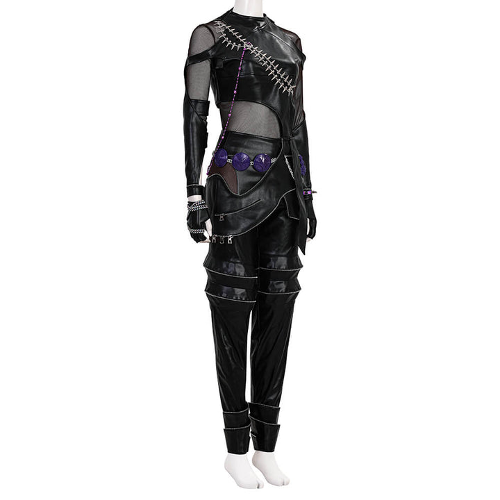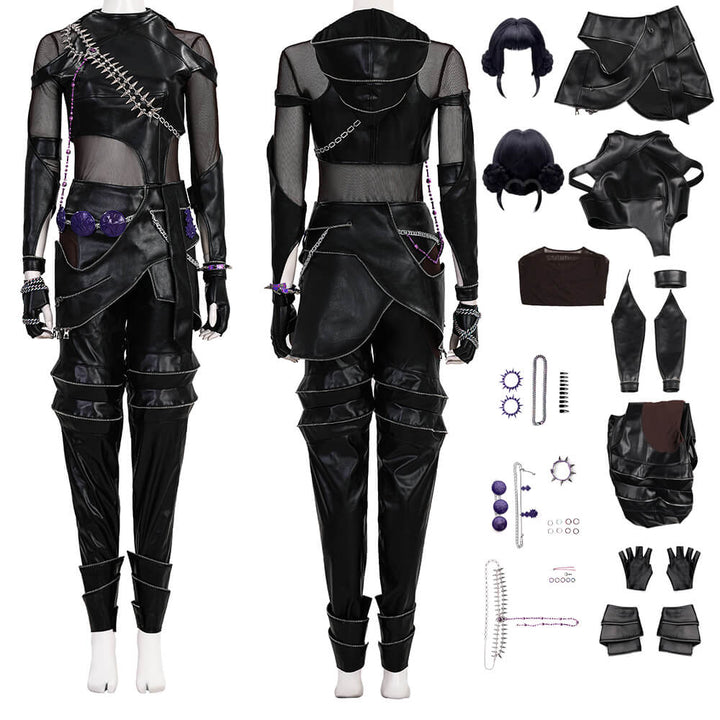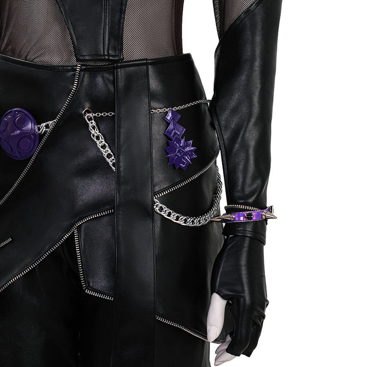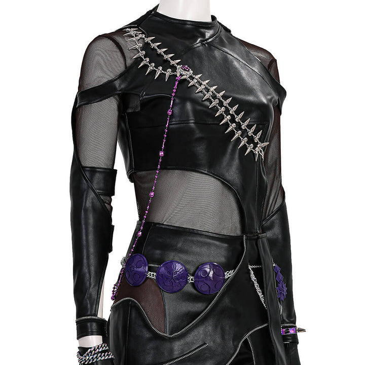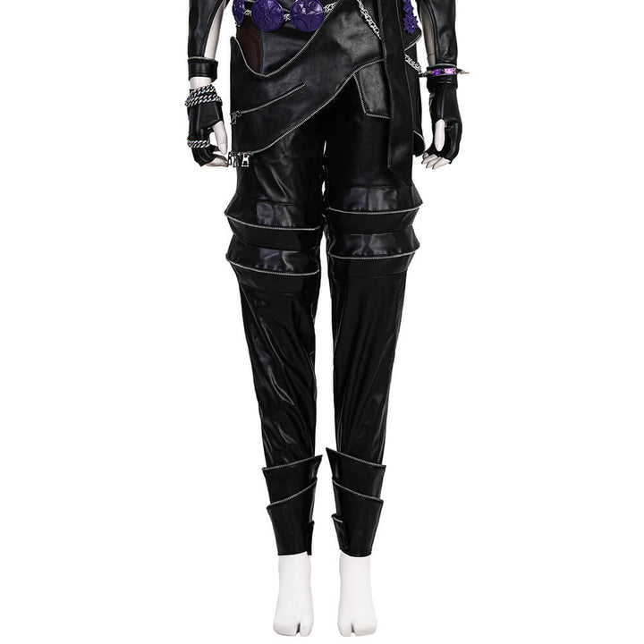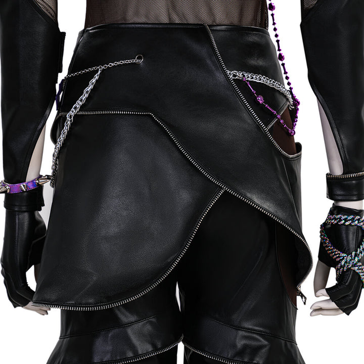 Package Includes: Full Zoey Kpop Demon Hunters Leather Cosplay Suit (Necklace*3, top, inner layer, apron, pants, leg warmers*2, gloves*2, rings*9, bracelet, ear ornaments*6, nail art, shoulder ornament, waist chain, hair accessory)